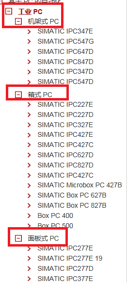 在左边树状结构菜单中可以看见“工业PC”选项,点击加号展开,可以看到机架式(Rack)PC/箱式(Box)PC/面板式(Panel)PC。分别展开后,可以看到此类型下IPC的具体型号。