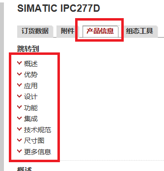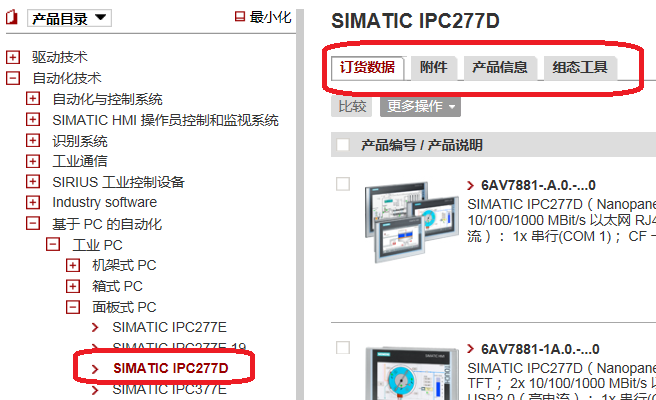 点击所需的IPC产品,右边页面会显示此产品的订货数据/附件订货数据/产品信息。