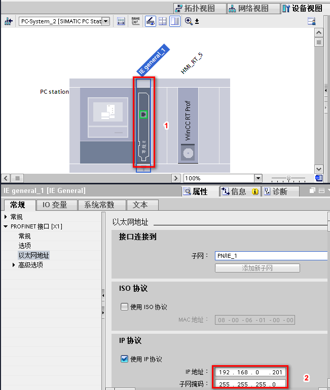 选中 PC Station 中的通信板卡,可在下方的“常规”选项卡的“PROFINET接口[X1]”中的“以太网地址”中设定运行项目的计算机的以太网地址。