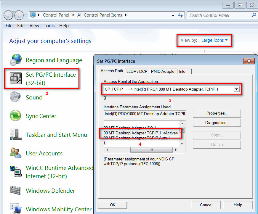 进入计算机控制面板,将右上角的查看方式改为“大图标”,然后点击 Set PG/PC Interface,并在打开的界面中选择应用程序访问点为“CP-TCPIP",在为使用的接口分配参数中选择”板卡名.TCPIP.1“的选项。