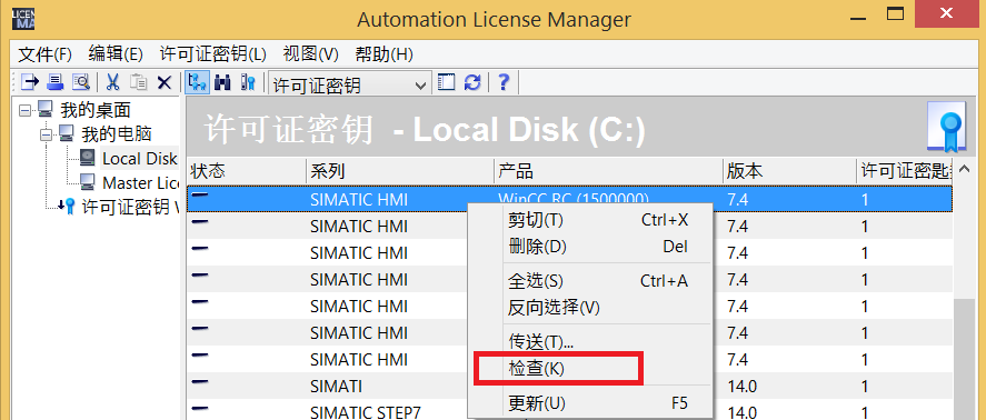 打开Automation License Manager软件,选择相应的授权文件,点击鼠标右键,在弹出的列表中选择Check(检查)选项。