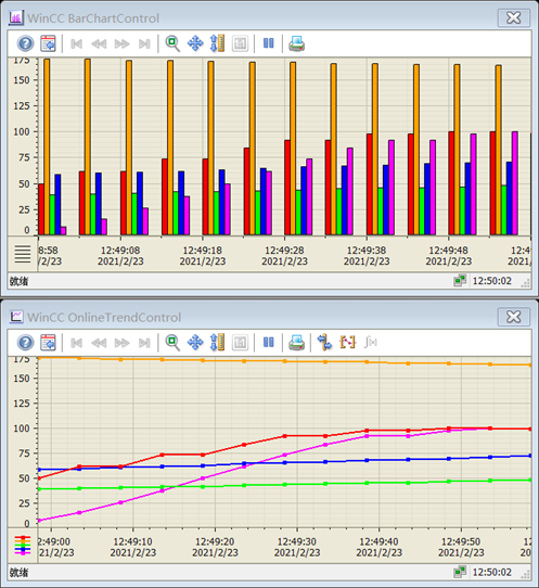 从WinCC V7.4版本起,WinCC画面将提供WinCC BarCharControl控件,以条形图的形式来显示WinCC实时数值或归档值。下图是使用BarCharControl以及在线趋势控件显示变量归档数据的对比。