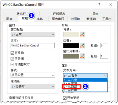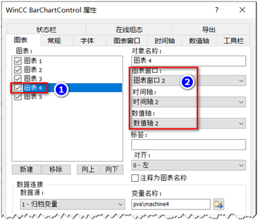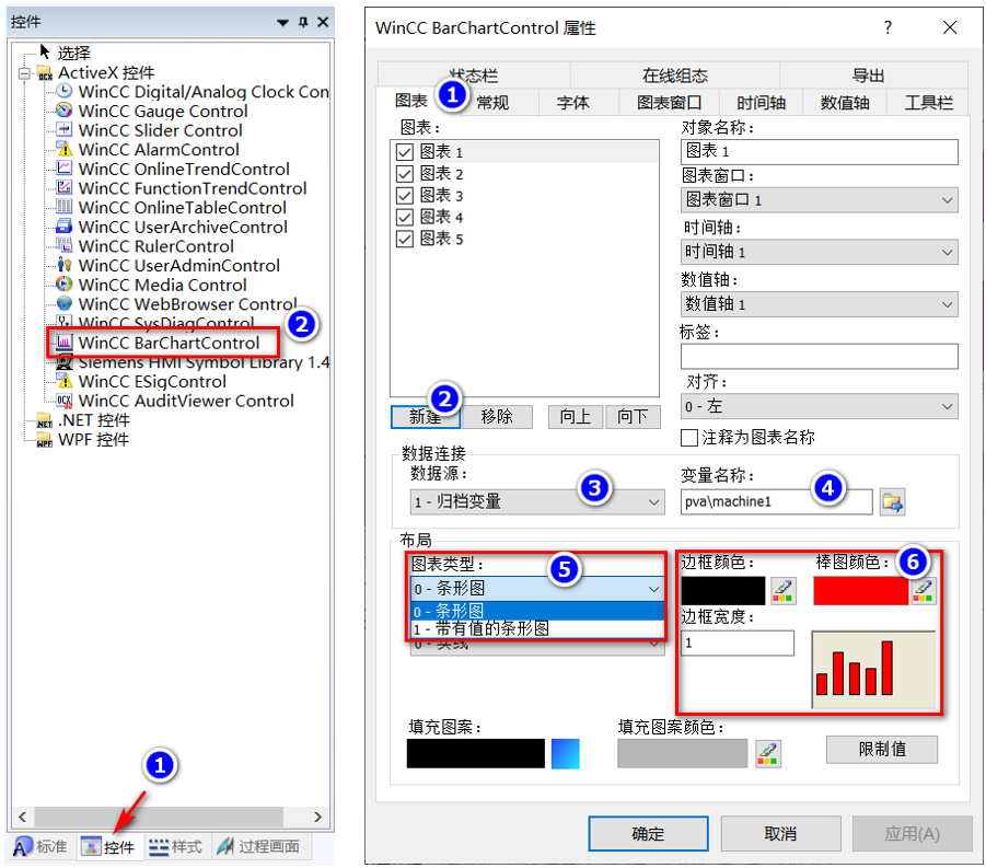 可以在控件中选择WinCC BarCharControl并拖拽到画面中。在弹出的组态对话框的“图表”栏中添加图表并为每个图表设置数据源、图表类型及棒图的颜色。如下图所示。