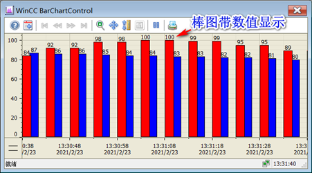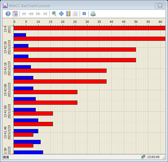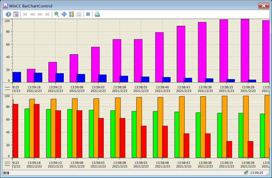 可以看出在线趋势控件能够更好地反映各个数据的变化,而BarCharControl不仅能显示归档数据及其变化趋势,还能更直观地反映不同时间点上各数据的对比关系。