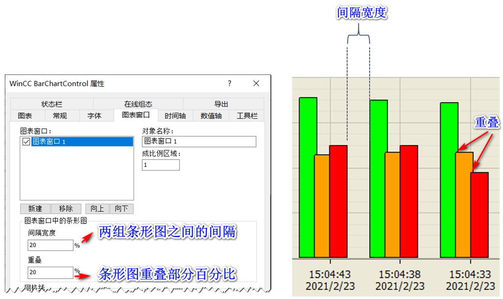 切换到“图表窗口”栏,可以设置条形图的间隔和重叠度,如下图所示。间隔宽度为以百分比表示的两组条形图之间的间隔,重叠为条形图组内的条形图的重叠百分比,如图所示。