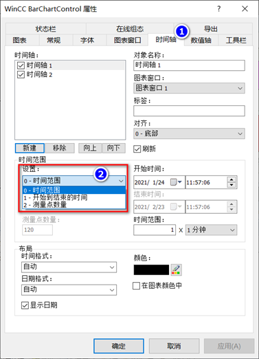 切换到“时间轴”可以设置BarCharControl的时间范围,这也决定了在BarCharControl控件中能显示多少组数据。例如,时间范围设置为1分钟,变量的归档周期为5秒,那么控件上将会显示12组条形图。