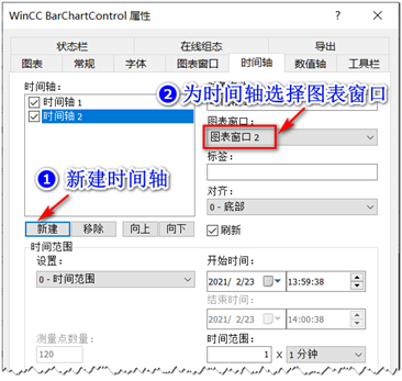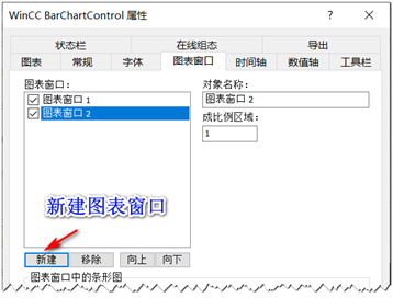 BarCharControl支持在多个图表窗口中显示条形图。如果需要使用多个图表窗口,那么不仅需要创建多个图表窗口,同时还需要为每个图表窗口创建对应的时间轴和数值轴,并且同一个时间轴或数值轴只能对应一个图表窗口。首先,切换到“图表窗口”栏,新建图表窗口。