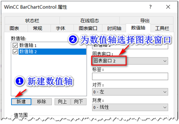 同样切换到“数值轴”新建数值轴,也分配给新建的图表窗口,如下图所示。