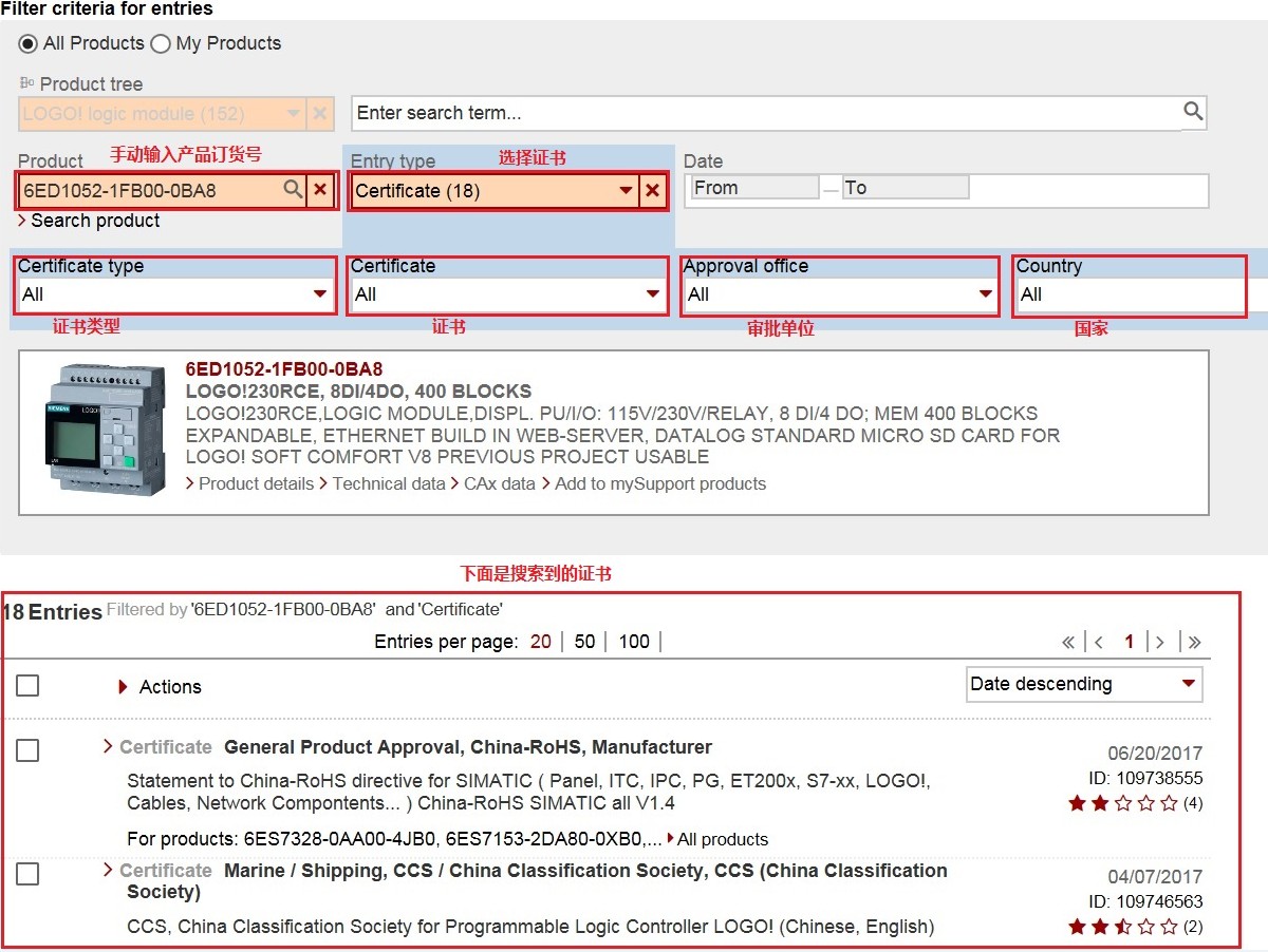 具体查找步骤:点击该链接可以打开西门子全球技术资源库关于LOGO!产品的所有证书信息,如下图所示。在证书分类搜索里可以按照证书类型、证书名称、审批单位或国家进行进一步筛选。