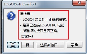 操作时要连接电缆,并且使LOGO!模块上电(如果无法正常连接,请手动将LOGO!硬件切换到STOP模式),否则会报下图错误: