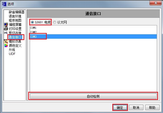 2.在LOGO!Soft-Comfort软件的菜单栏:工具---选项---通信接口,选择所使用的串口。