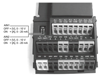 为了正确选择模拟量输入类型,仅仅修改参数P0756是不够的。更确切地说,要求端子板上的 DIP 开关也必须设定为正确的位置。DIP 开关的设定值如下: