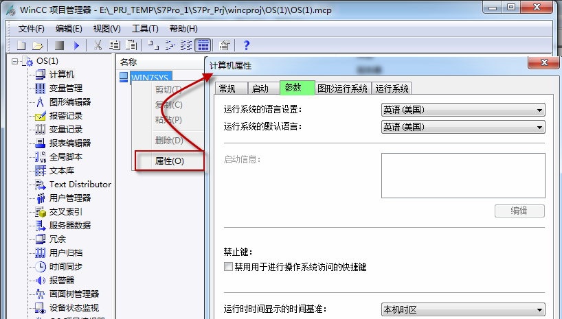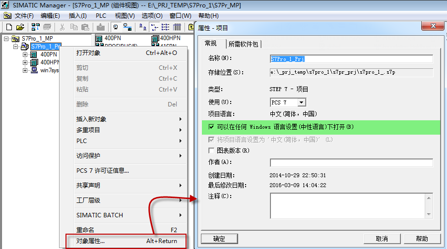 PCS 7在创建项目是会记录系统区域语言。在单项目上点击右键,通过“对象属性”菜单,勾选“可以在任何Windows语言设置(中性语言)下打开”。