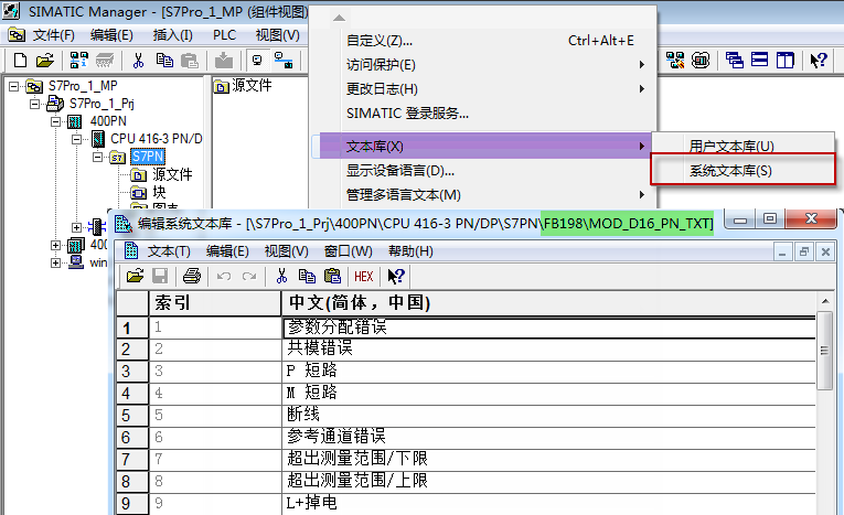PCS 7的功能块的消息文本部分来自于AS文本库,包括用户文本库和系统文本库。选中CPU下的S7 program后通过“系统文本库”查看程序中包括的系统文本库。