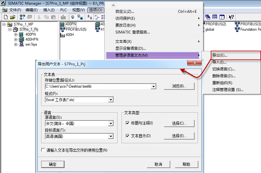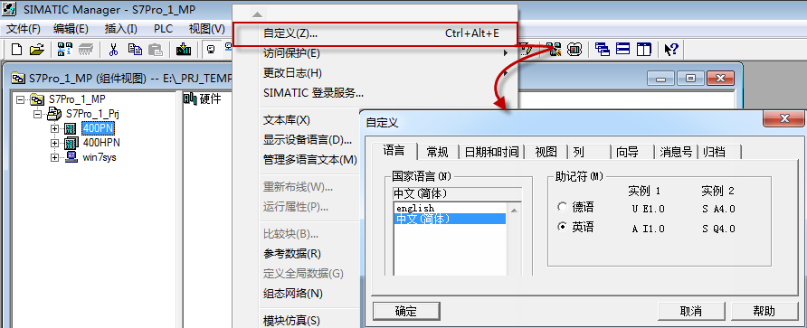 如果安装的是PCS 7亚洲版本,可以将STEP 7界面切换至中文,菜单如下图: