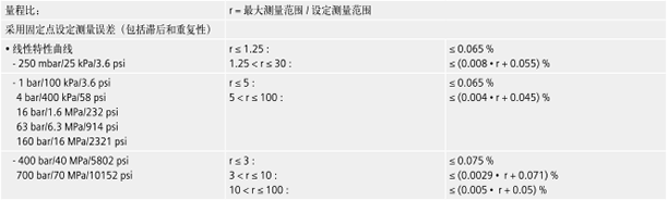 设定测量范围为 100 kPa,如果选择0.01... 1bar,最大测量范围为 100kPa。量程比 r = 100/100=1 ,精度 ≤0.065% ,误差为 100*0.065/100kPa=0.065kPa;