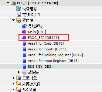 由于在获取授权密钥前,“MODBUSPN”指令是无授权状态,会使CPU报错而停机。而为了读取CPU 的“IDENT_CODE”码,需要CPU运行起来,则必须添加编程错误组织块OB121,如下图所示: