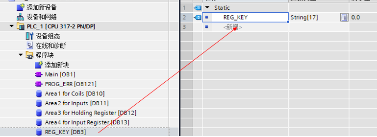 创建授权密钥数据块DB3(名称REG_KEY),选择类型为“全局DB”,打开该DB块,创建变量“REG_KEY”,数据类型为“String[17]”,如图所示: