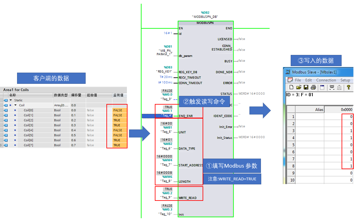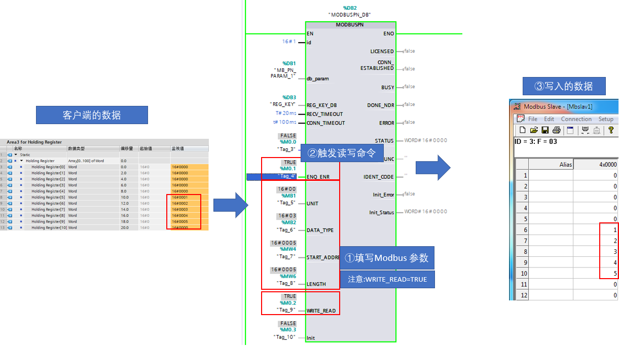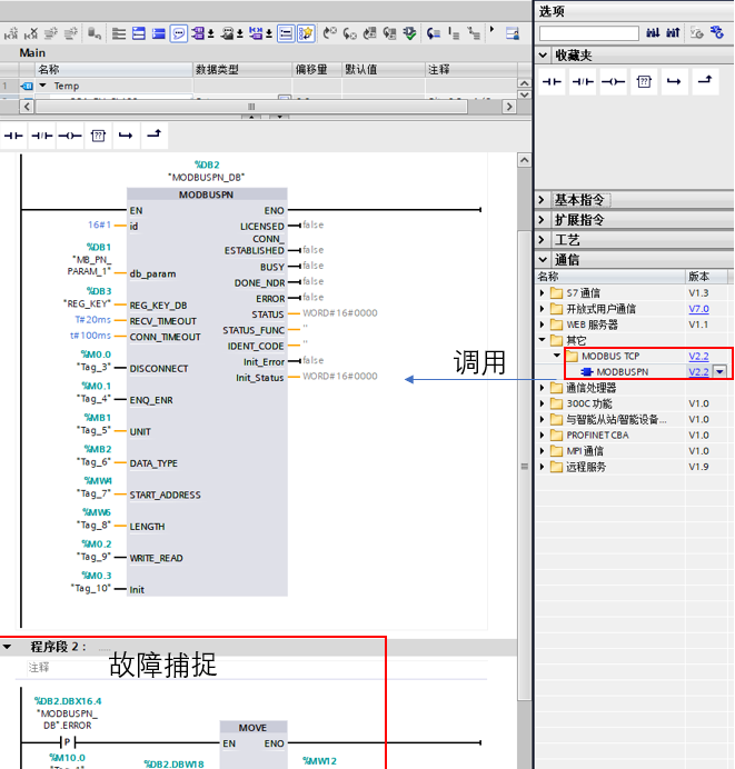 调用MODBUS TCP指令(通信---其他---MODBUS_TCP---MODBUSPN),填写参数。