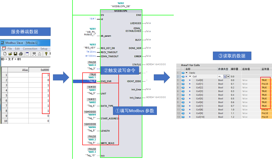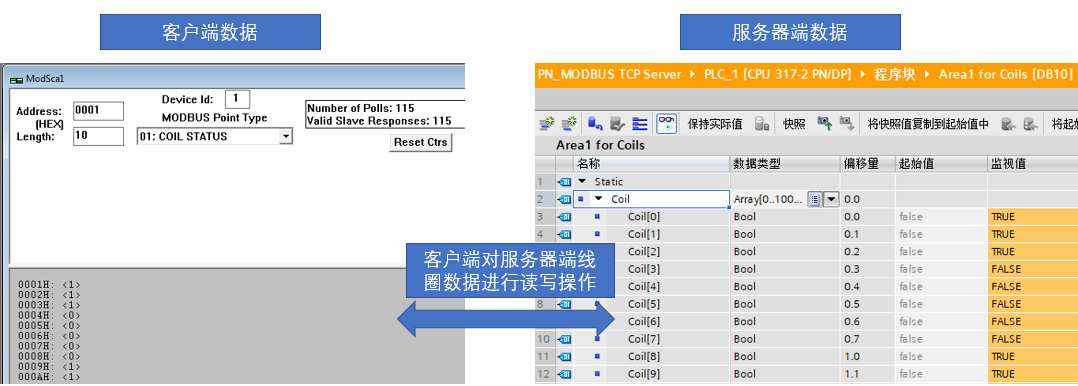 示例1:客户端读写服务器【 线圈寄存器 】,偏移量0,长度为10的数据