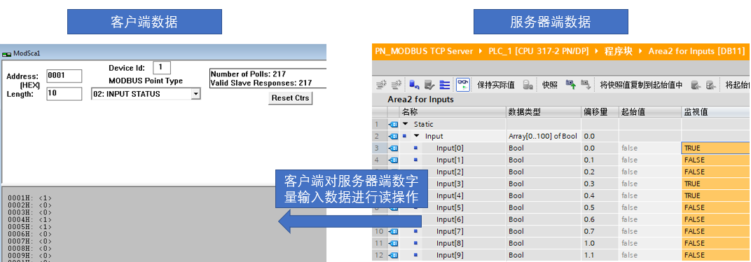 示例2:客户端读取服务器【 数字量输入寄存器 】,偏移量0,长度为10的数据
