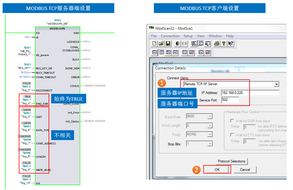 按照如下设置,使能服务器端,并使用ModScan32建立连接