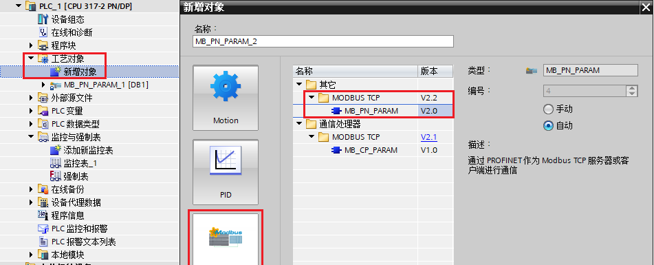 ①新增工艺对象,选择“Modbus”---"其他"---“MODBUS_TCP”---"MB_PN_PARAM"