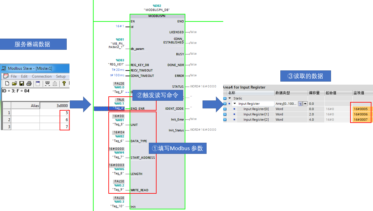 示例2:客户端读取服务器【输入寄存器】,偏移量0,长度为3的数据