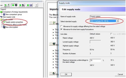 双击”supply system properties”,在弹出的界面中选择进线电压:230V 50Hz或者400V 50Hz等,点击OK确定。