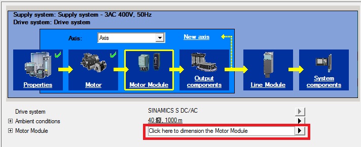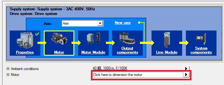 S120系统的选型按照从左至右的顺序依次选择电机、电机模块、输出组件、电源模块、系统组件。首先,点击Motor右边的方框进入电机配置向导。 |