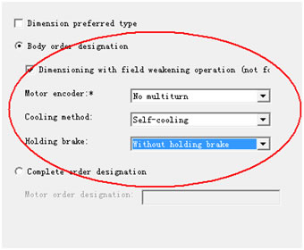 选择电机编码器类型、冷却方式、是否带有抱闸。