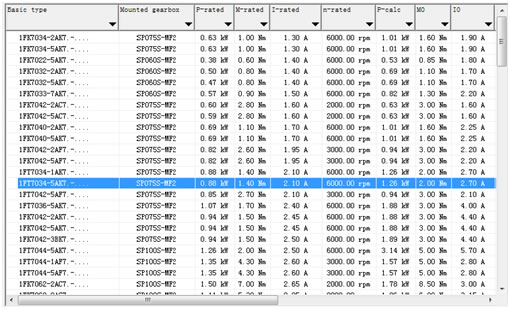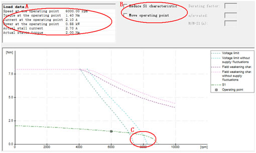 选择电机后会出现电机的负载特性曲线画面,以检查与负载是否匹配。电机的选型应基于电机特定的极限特性曲线。这些曲线描述超过转速的转矩走势或功率走向,并考虑到直流母线电压为基础的电机极限。
