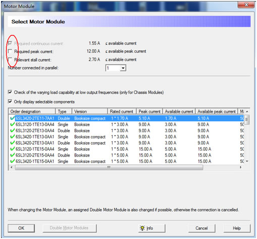 Sizer软件会自动计算出三个电流,并列出所有满足要求的电机模块,从小到大顺序排列,这三个电流依次是: