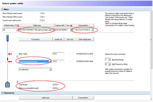 电机电缆的选择画面: