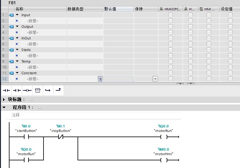 S7-1200 PLC 编程可以使用的代码块有 OB 块,FC 块和 FB 块。功能块 (FB) 是从另一个代码块(OB、FB 或 FC)进行调用时执行的子例程。在调用 FB 块时会生成与之相匹配的背景数据块,在背景数据块中可以存储定义的接口参数及静态变量。