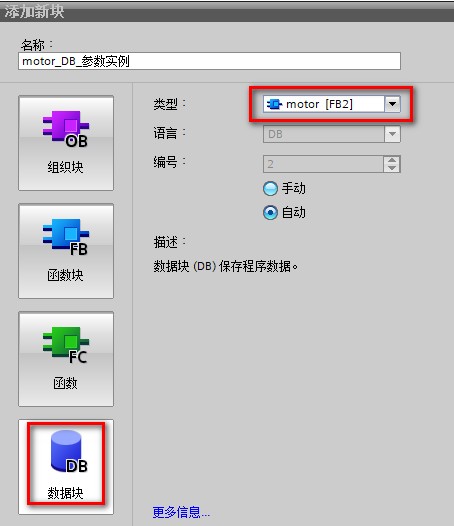 添加新块,选择 DB 块,类型选择 motor(FB2 的背景数据块),如图 13 所示。