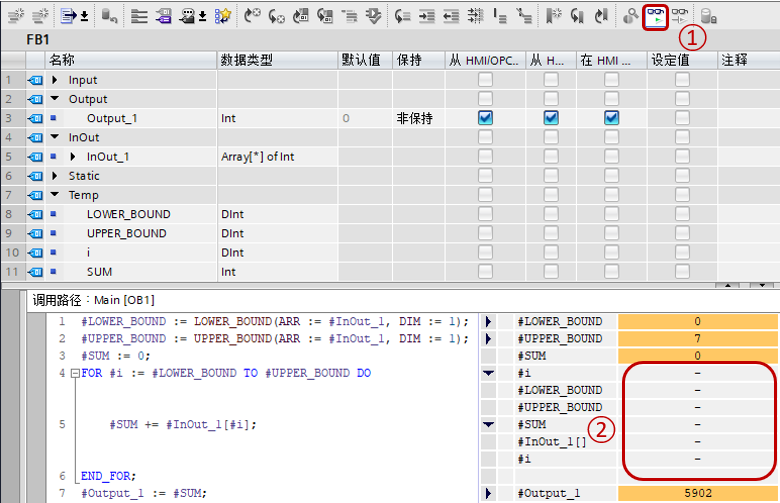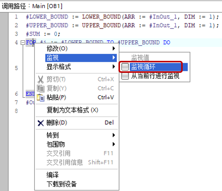 如果希望监视循环内部执行情况,可以在监视中的SCL程序任意位置,如图2中操作。