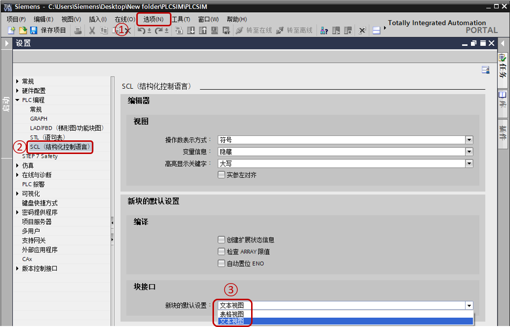 ③在块接口选择“文本视图”,此设置默认选择表格视图。设置完,再新建的SCL块即使用所选择的视图。之前新建的SCL块不变。