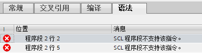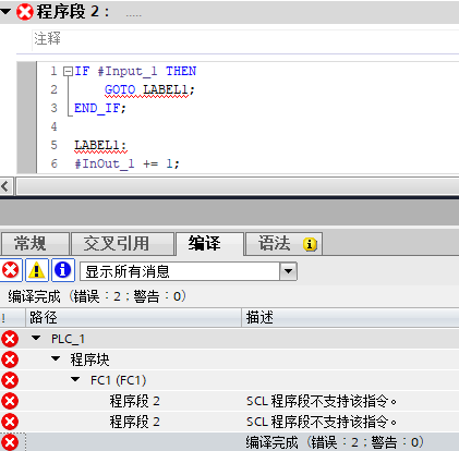 如图12-13所示,在LAD/FBD中的SCL编写GOTO指令时会编译报错,所以不要在这里编写GOTO指令。建议在LAD/FBD中的SCL不要使用过于复杂的编程,如果需要实现较为复杂的程序,建议单独把SCL组织成为一个子程序,然后在LAD/FBD中调用。