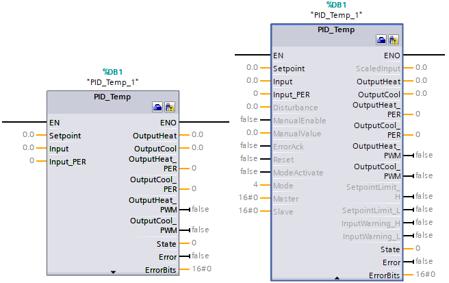 PID 指令块的参数分为两部分,输入参数与输出参数。其指令块的视图分为扩展视图与集成视图,在不同的视图下所能看见的参数是不一样的,如图 3 所示。