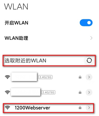 2. 选取附近的 WLAN 网络,选择 1200Webserver 网络,如图 2 所示。