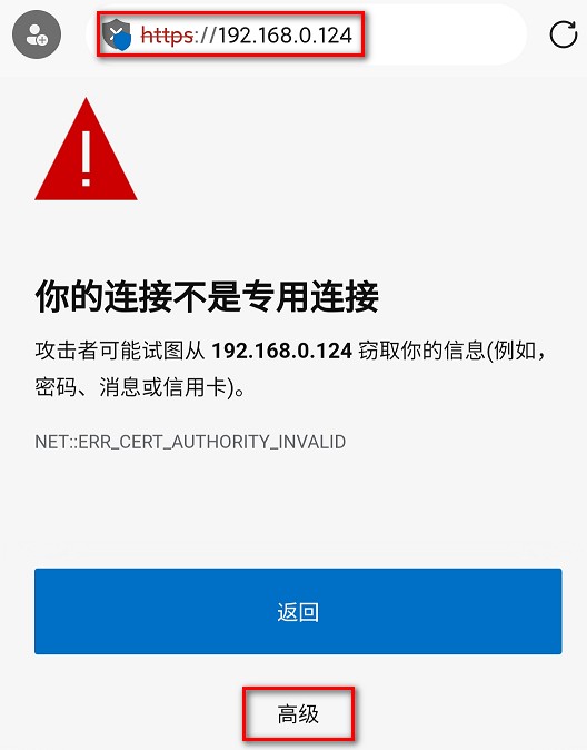 1. 打开手机中 Edge 浏览器,在地址栏中输入 https://192.168.0.124,前往访问,显示:‘’你的连接不是专用连接“,点击下方高级按钮。如图 6 所示。