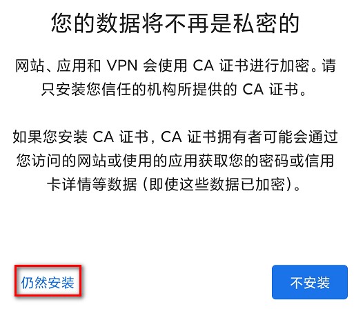 9. 手机会提示警告信息:您的数据将不再是私密的,点击下方仍然安装,如图 14 所示。