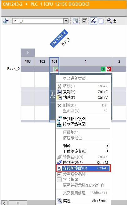 项目在线后,打开“设备视图”,在 CM1243-2 模块上点击鼠标右键,选择”在线和诊断“功能,如图1所示: