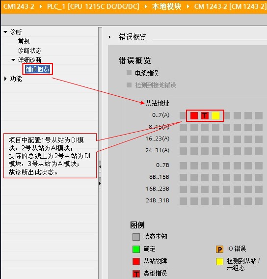 进入在线诊断界面,在”诊断——>详细诊断——>错误概览“菜单下,可看到有组态的从站地址和实际的不符,出现如图2所示的状态: