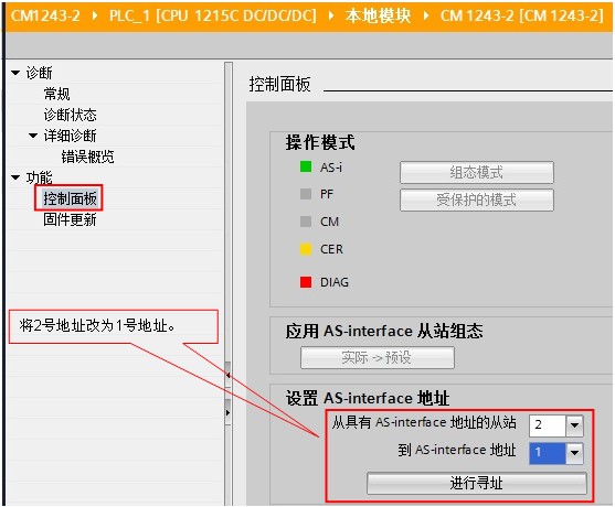 接着,需要进入”功能——控制面板“操作修改从站地址,如下图3所示,将实际的2号站改为了和组态一致的1号站地址: