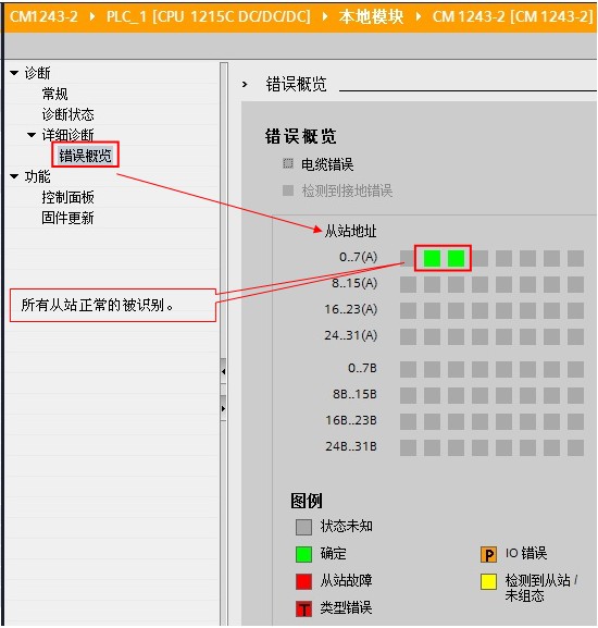 修改地址完毕,回到”诊断——>详细诊断——>错误概览“菜单下,可看到项目中组态的从站地址和实际的完全相同,出现如图5所示的正确状态: