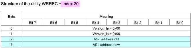 CM1243-2 手册章节7.2.2.9 所描述的命令,可用于使用指令“WRREC”将索引号 20 发送命令修改 AS-i 从站地址,命令格式如图6所示:
