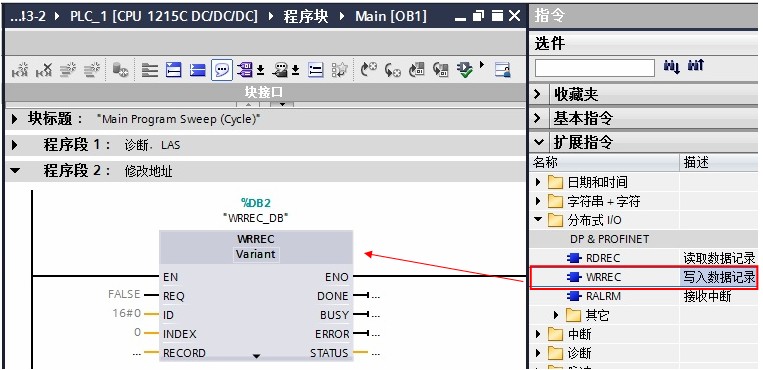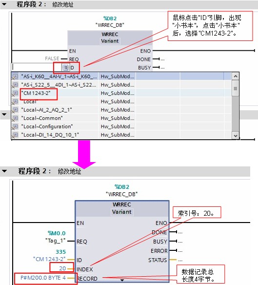 首先,已经通过 TIA Portal 软件组态正确组态 AS-i 主站和从站,如果从站地址不正确则使得 CM1243-2 “CER” 指示黄色灯常亮,“DIAG”指示灯红色闪烁,此时可使用指令“RDREC”将索引号 20 发送命令修改 AS-i 从站地址,编程如图7所示: