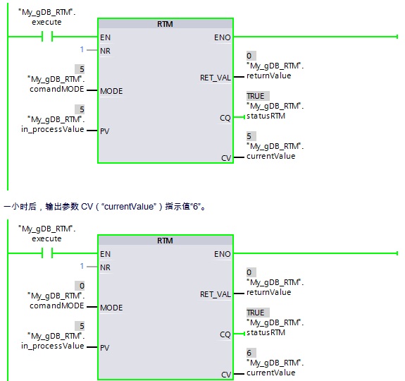 在OB1中编程,输入参数 MODE的值设置为“5”,如果EN输入端的信号状态为“TRUE”,则执行“RTM”指令。CPU 的运行小时计数器设置为PV中的数值并启动。在启动运行小时计数器后,将输入参数 MODE的值设置为“0”。因此,“RTM”指令读取运行小时计数器的当前值并写入输出管脚CV。输出参数 CQ指示运行小时计数器正在运行。输出参数 RET_VAL指示处理正在运行,且无错误。